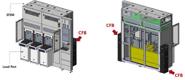 - CFB는 반도체 생산장비EFEM의 좌, 우측에 설치되는 장치로 ETCH 공정 전 후 잔여Gas 등으로 인한 불량이 지속적으로 발생함에 따라 Hot N₂Purge를 통한 Cross Contamination을 방지하기 위하여 개발된 설비입니다.