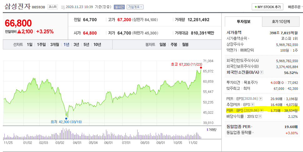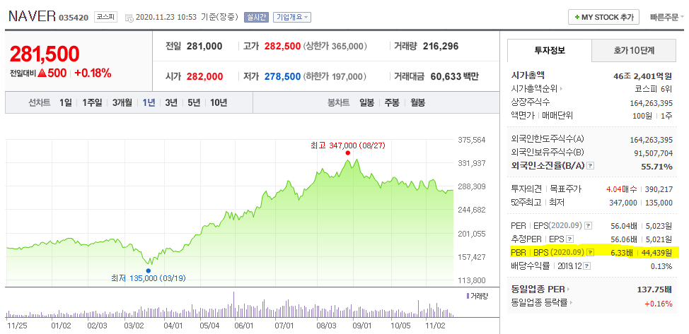 삼성전자의 PBR의 경우 1.73배, 네이버(Naver)의 PBR의 경우 6.33배입니다. 즉 업종에 따라 순자산의 평균 크기는 다를 수 있기 때문에 동일 업종에 비해서 PBR이 높은지 낮은 지를 판단하는 것이 중요합니다. 상대적으로 PER, EPS가 현재 주가의 가치를 판단하는데 많이 사용되지만, PBR, BPS의 경우 현재 주가의 하단을 판단하기에 유용합니다. 특히 코로나 시장 등의 하락장세에서 이 종목이 지금 바닥을 찍었는지 판단할 때 사용하면 현명한 투자를 할 수 있습니다.
